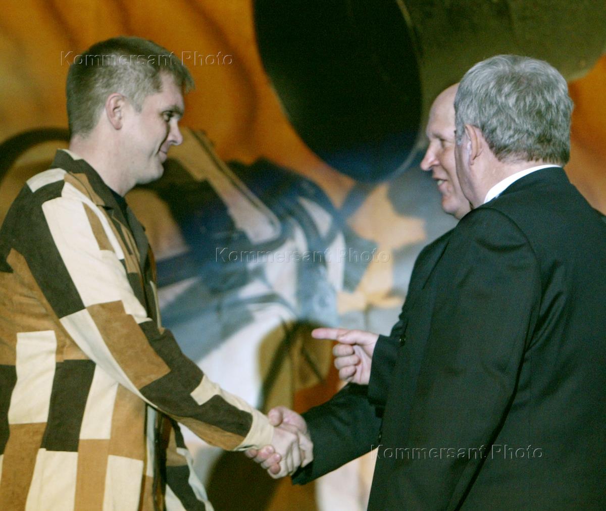 Директор фотослужбы Издательского Дома "КоммерсантЪ" Эдди Опп (слева) во время вручения ему премии гильдии профессиональных фотографов СМИ России "Золотой глаз" на ежегодном благотворительном бале прессы. Премию вручал президент гильдии профессиональных фотографов Сергей Лидов (справа). Торжественная церемония состоялась в "Конгресс Холле" Центра Международной Торговли.