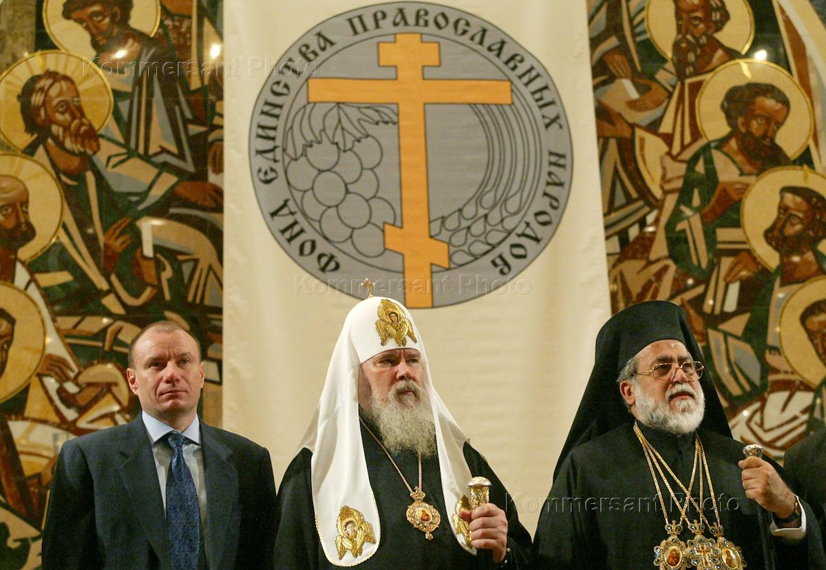 Patriarch of Moscow and All Russia Alexis the Second (centre), Pope and Patriarch of Alexandria and All Africa Petros the Seventh (right) and president of Interros holding Vladimir Potanin (left) attend the church awards 'For Activities to Strengthen Unity of Orthodox Peoples' ceremony. The awards ceremony was held in the Christ the Saviour Cathedral Ecclesiastic Congregations Hall.