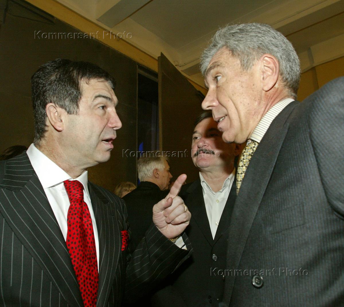 Businessman Anzori Aksentyev (left) talks to the popular television host Yury Nikolayev during the Golden Eagle film awards ceremony held on the premisers of Mosfilm Studios.