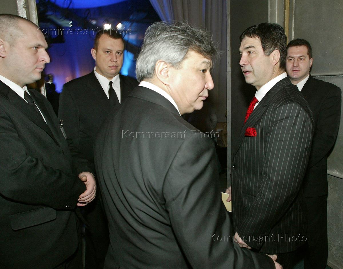 Businessman Anzori Aksentyev (left) talks to the popular television host Yury Nikolayev during the Golden Eagle film awards ceremony held on the premisers of Mosfilm Studios.