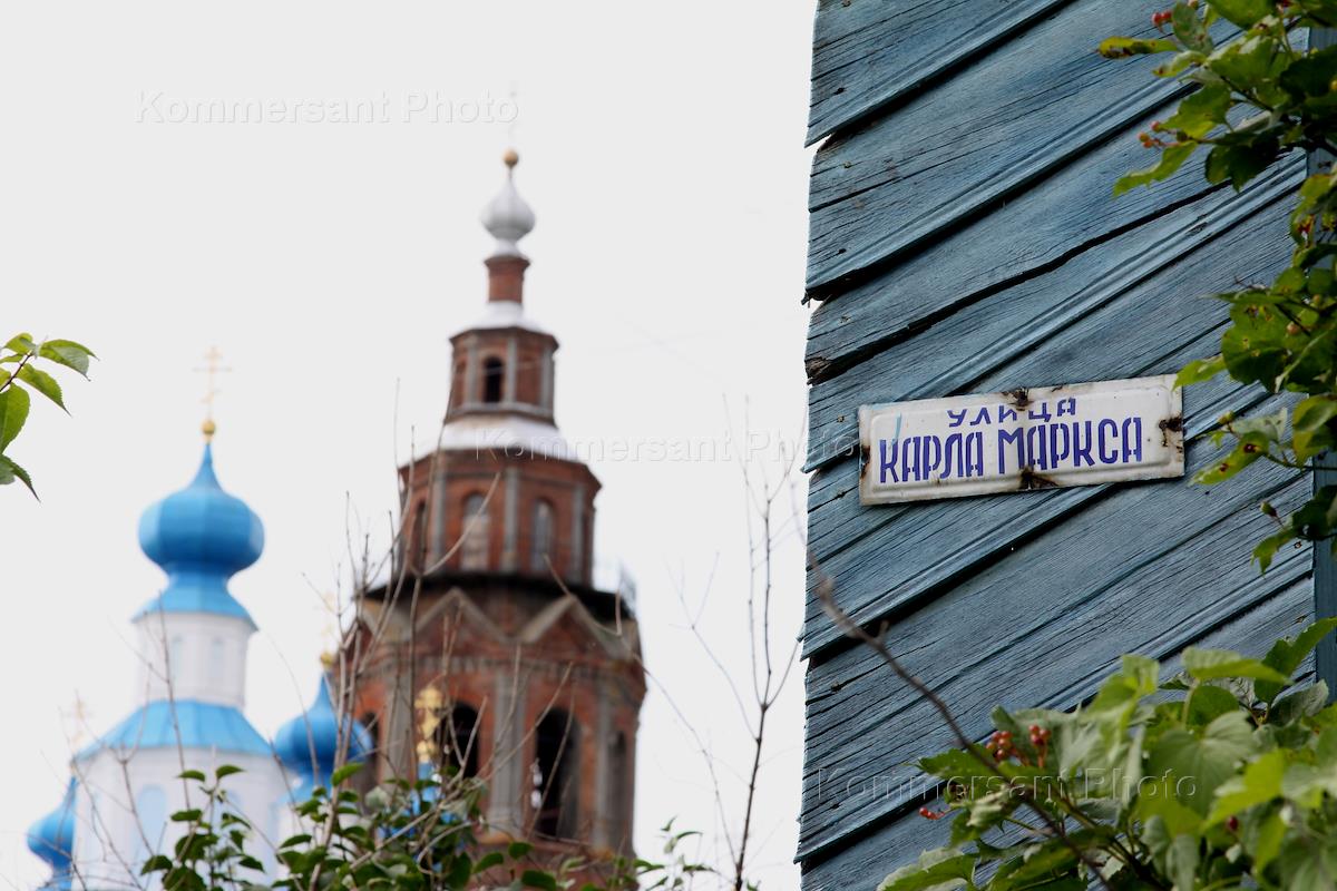 Жанровая фотография. Табличка с надписью "Улица Карла Маркса" и здания церквей в Чердынь.