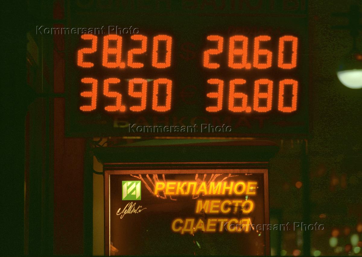 Exchange rates of US dollar and euro against Russian rouble displayed on the electronic screen outside a currency exchange office.