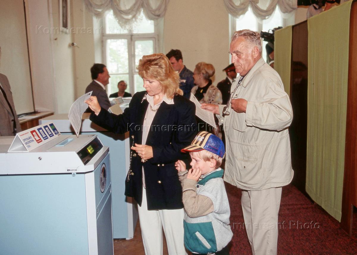 Выборы президента России. Кандидат на должность президента России, действующий президент России Борис Ельцин (в центре) после голосования на избирательном участке.
