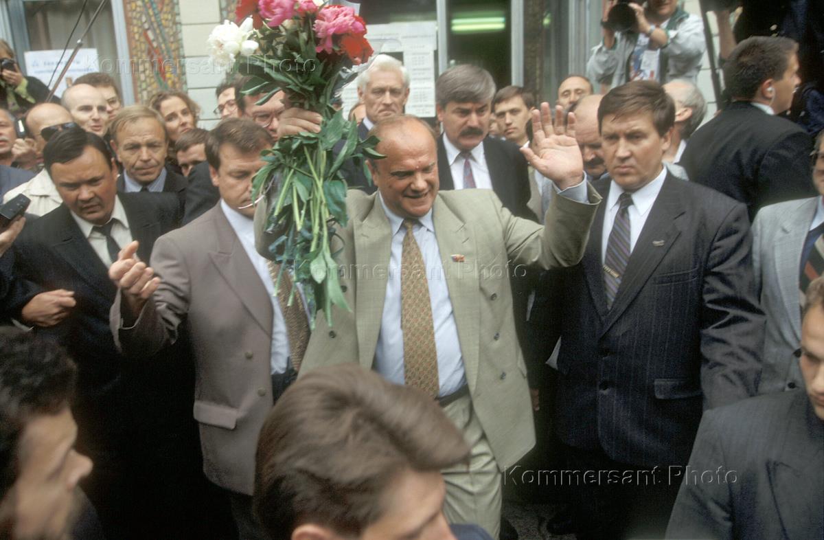 Выборы президента России. Кандидат на должность президента России Геннадий Зюганов (в центре) после голосования на избирательном участке.