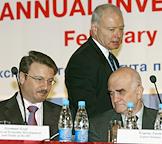 Left to right: Russian Trade and Economic Development Minister German Gref, president of the American Commerce Chamber in Russia Andrew Sommers, and Russian economist, rector of the Moscow High School of Economics Yevgeny Yasin take part in the 5th annual investments conference of the American Commerce Chamber in Russia. The conference was held in the Radisson Slavyanskaya Hotel.
