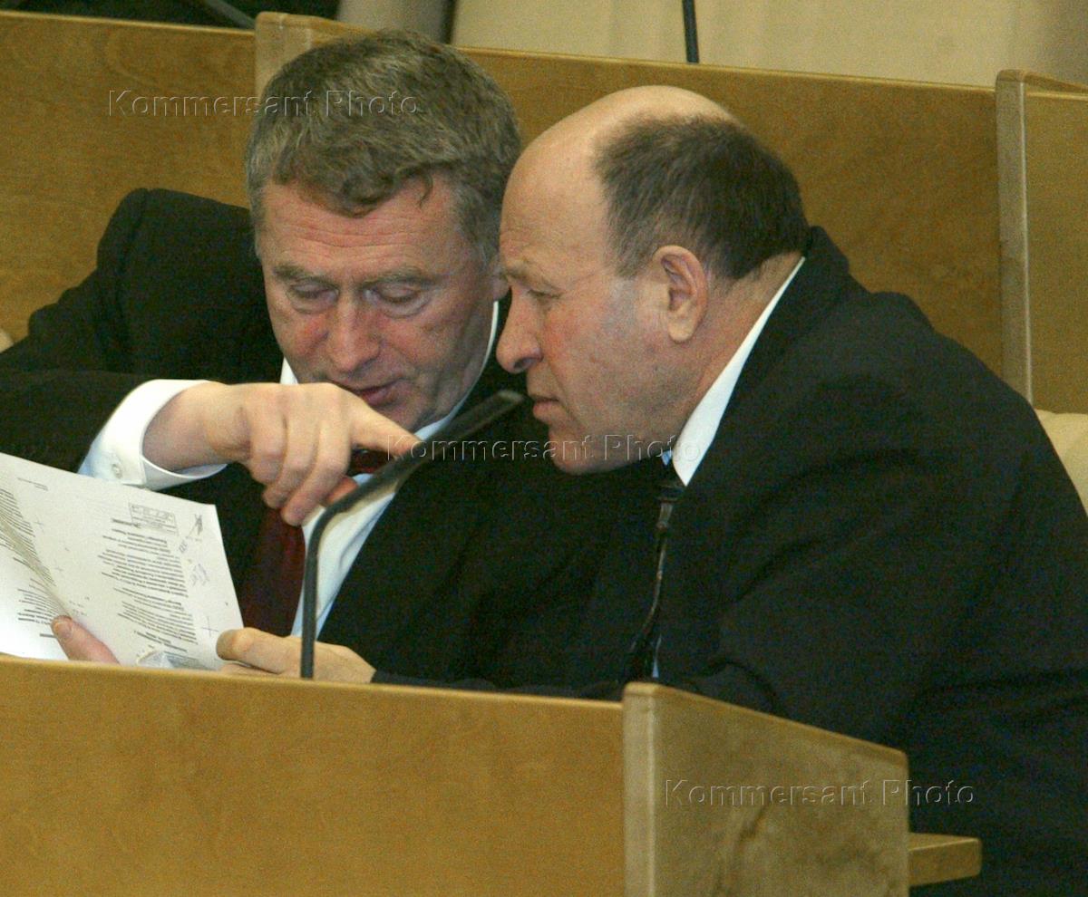 Russian State Duma Defence Committee member Oleg Malyshkin (right) and Duma Deputy Chairman Vladimir Zhirinovsky (left) took part in the session.