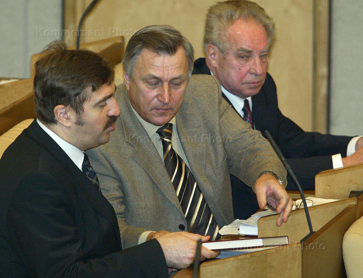 Left to right: vice speakers of the State Duma Vladimir Pekhtin, Artur Chilingarov and Oleg Morozov chat away during a session of the legislature.