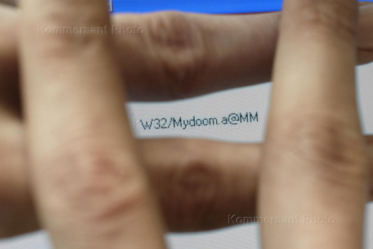 Название компьютерного вируса на экране монитора. Пальцы, сложенные решеткой.