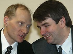 Russian Deputy Trade and Economic Development Minister Mikhail Dmitriyev (left) talks to the high-ranking official of the Cabinet administration Vsevolod Vukolov (right) during the round-table conference held to discuss the problem of exsessive functions of the federal executive agencies. The conference was held in the Alexander-House Business Centre.
