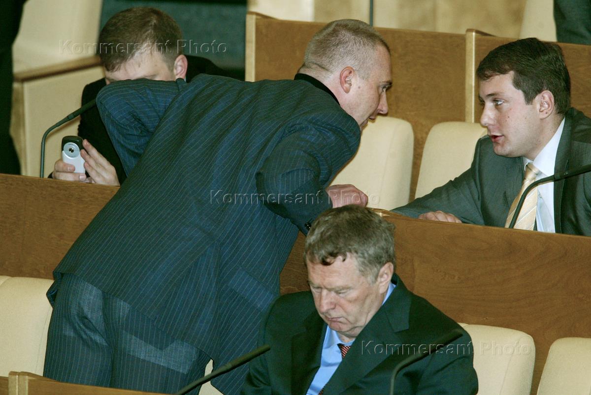 Chairman of the State Duma Liberal Democratic (LDPR) faction Igor Lebedev (left, leaning to the row behind him) and vice-speaker of the legislature, LDPR party leader Vladimir Zhirinovsky (sitting next to Mr Lebedev) take part in a plenary session.