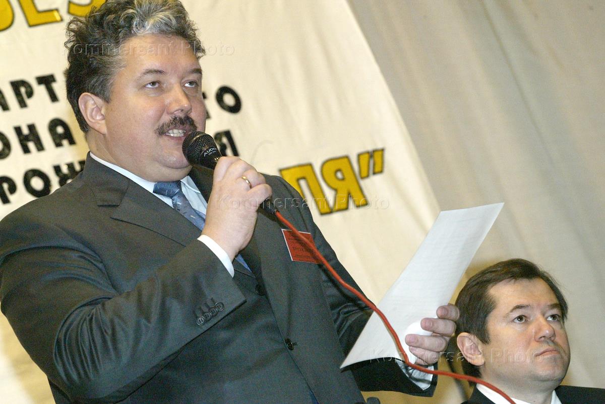 Лидер партии "Народная воля" Сергей Бабурин (слева) и сопредседатель блока "Родина" Сергей Глазьев (справа) во время IV съезда партии "Народная воля", посвященного созданию единой политической партии на базе избирательного блока "Родина". Съезд прошел в малом концертном зале гостиничного комплекса "Измайлово".