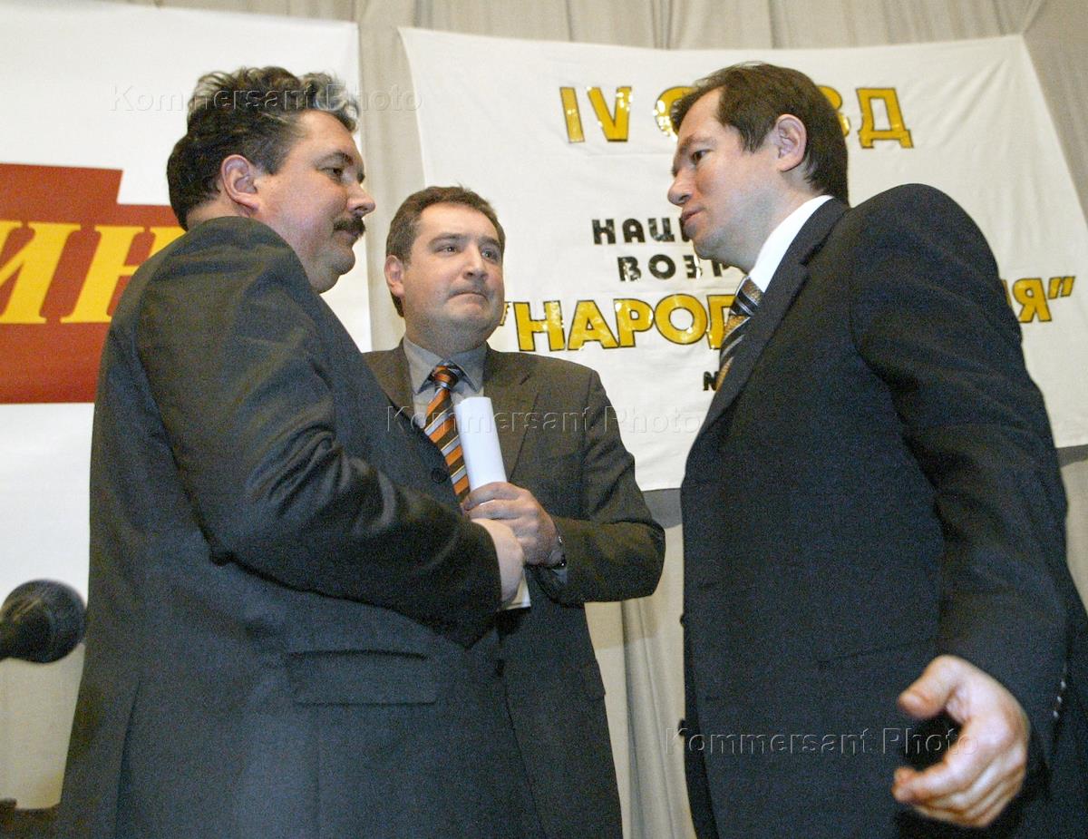 Лидер партии "Народная воля" Сергей Бабурин (слева), сопредседатели блока "Родина" Сергей Глазьев (в центре) и Дмитрий Рогозин (справа) во время IV съезда партии "Народная воля", посвященного созданию единой политической партии на базе избирательного блока "Родина". Съезд прошел в малом концертном зале гостиничного комплекса "Измайлово".