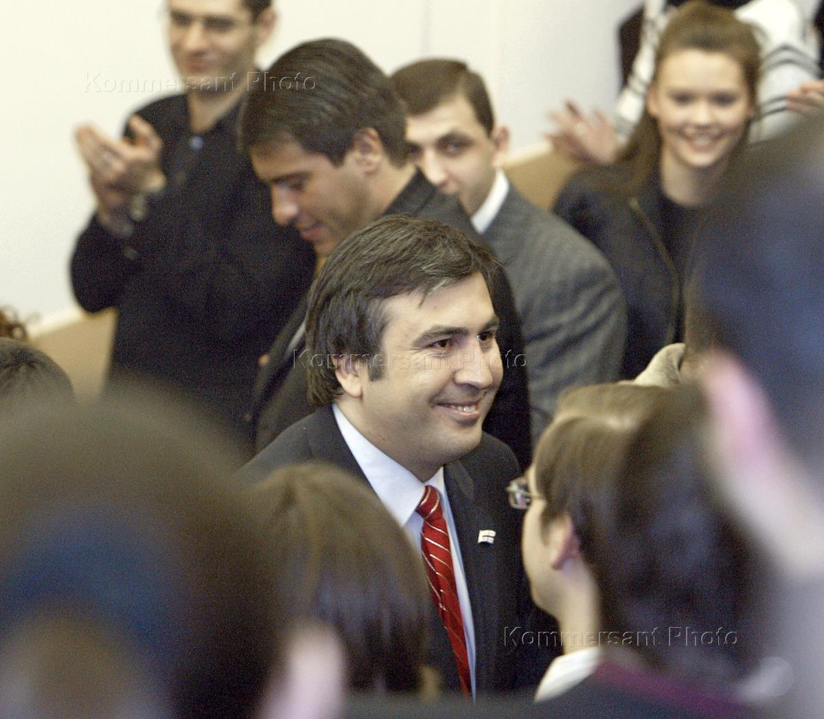 Президент Грузии Михаил Саакашвили (в центре) во время своего посещения Московского государственного института международных отношений (МГИМО), где он выступил с лекцией.