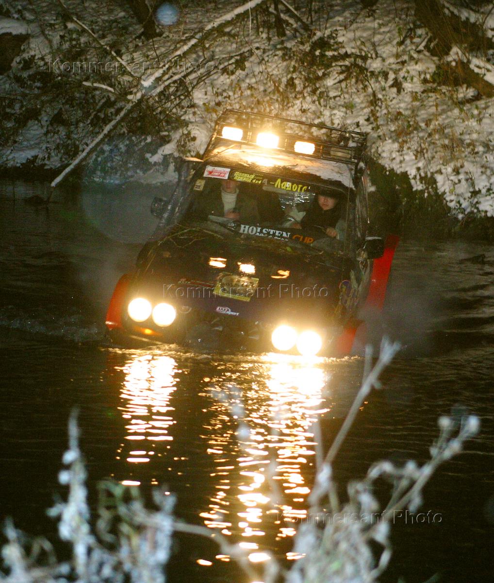 Participants of the "Russian safari" car race transfer through the river.
