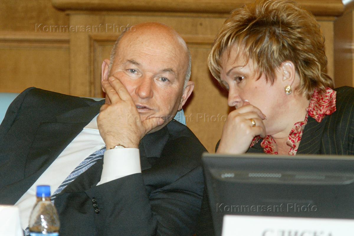 Moscow Mayor Yury Luzhkov (left) and Russian State Duma first deputy chairman Luybov Sliska (right) took part in the 6th conference of the Russian Audit-Accounting Organisations Association. The conference was held in the Accounting chamber of Russia building.