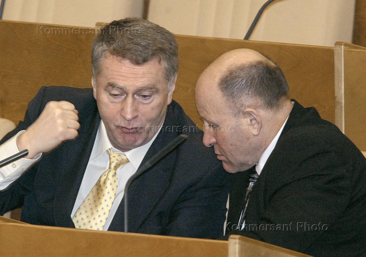 Russian State Duma Defence Committee member Oleg Malyshkin (right) and Duma Deputy Chairman Vladimir Zhirinovsky (left) took part in the session.