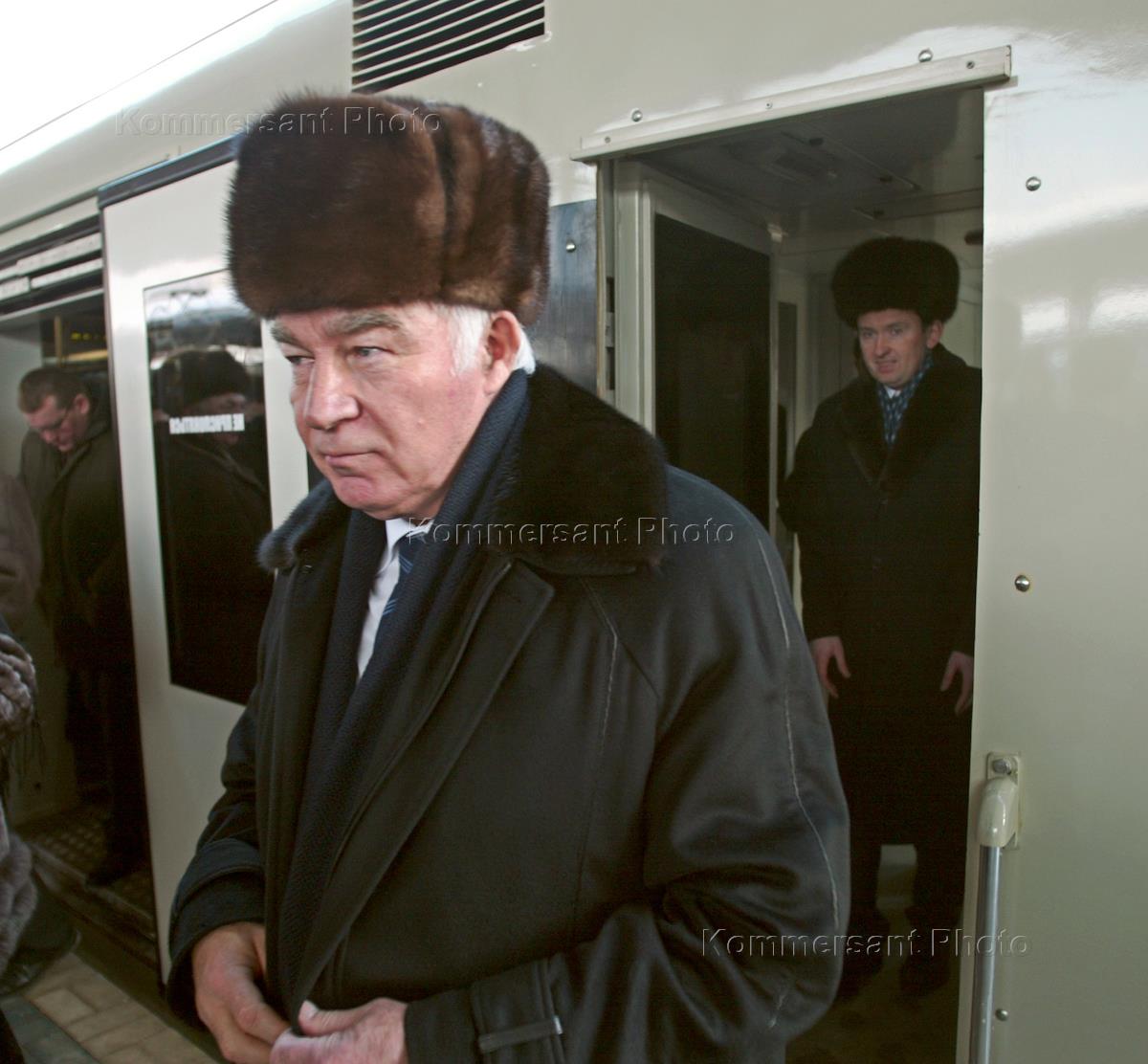 Мэр Москвы Юрий Лужков (слева) и президент ОАО "Российские железные дороги" (РЖД) Геннадий Фадеев (справа) во время церемонии открытия скоростного пригородного движения на участке Москва - Мытищи, с использованием электричек нового поколения "Спутник". Церемония прошла на Ярославском вокзале.