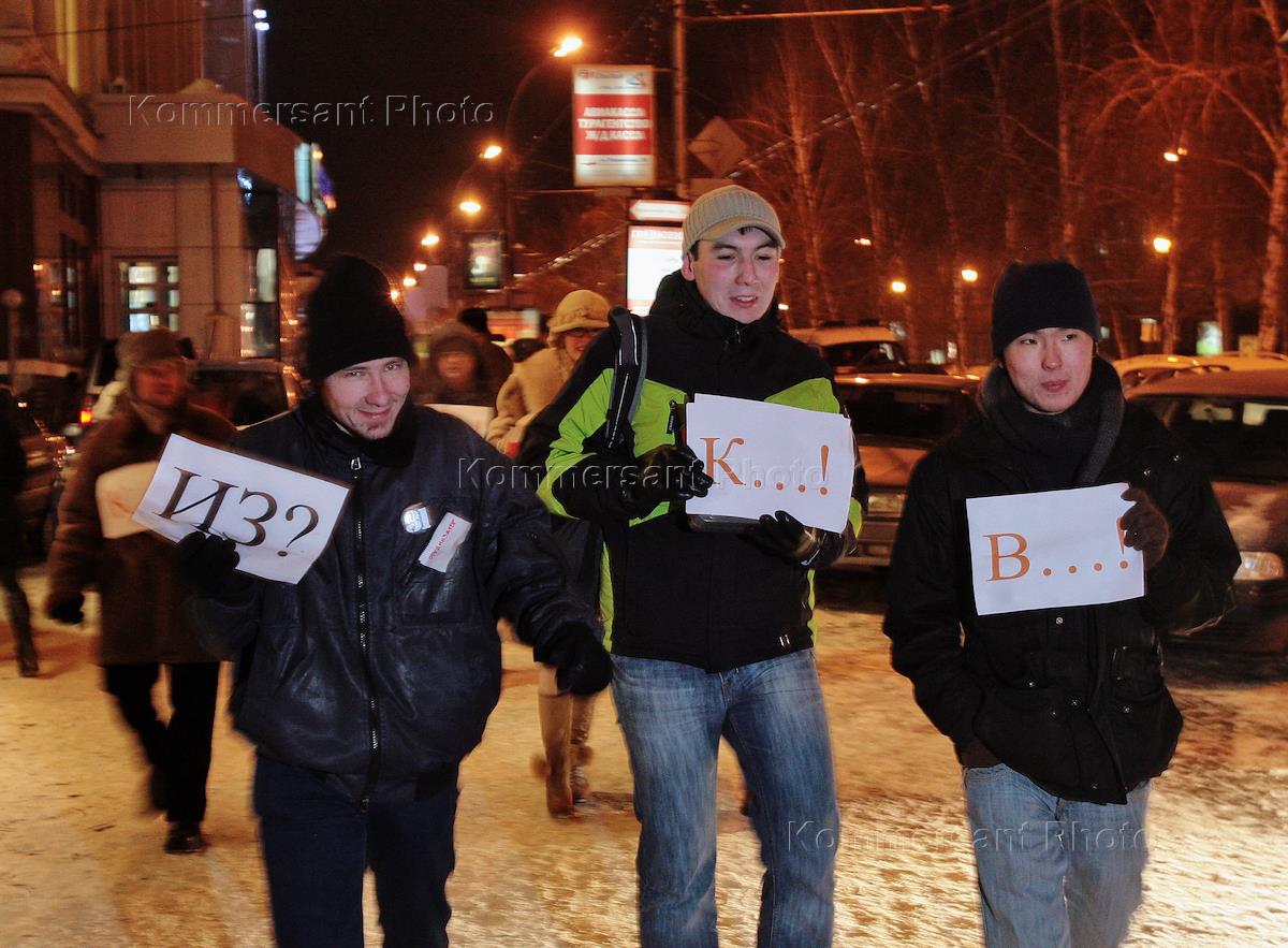 Новосибирские участники движения "Стратегия-31" во время проведения мирного шествия от дома Офицеров до Первомайского сквера. Участники шествия пришли на мероприятие с транспарантами "В ... !", "Не смотря на ... !", "К ...!".