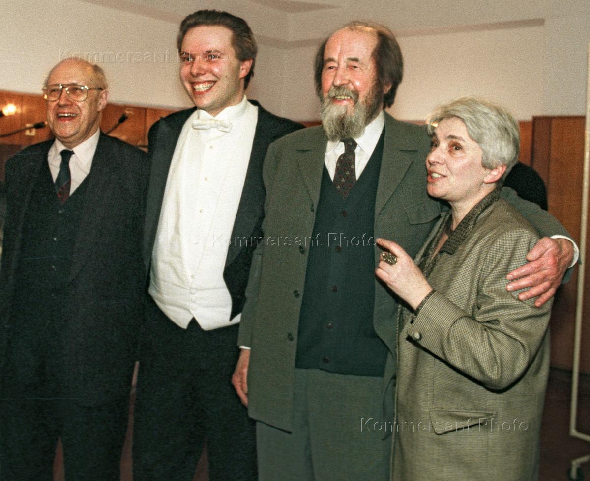 Writer Alexander Solzhenitsyn (right) with his wife Natalya (left) and violinist and conductor Mstislav Rostropovich (centre) attended the concert of pianist Ignat Solzhenitsyn. The concert of the writer's son took place in the Big hall of the Conservatory.
