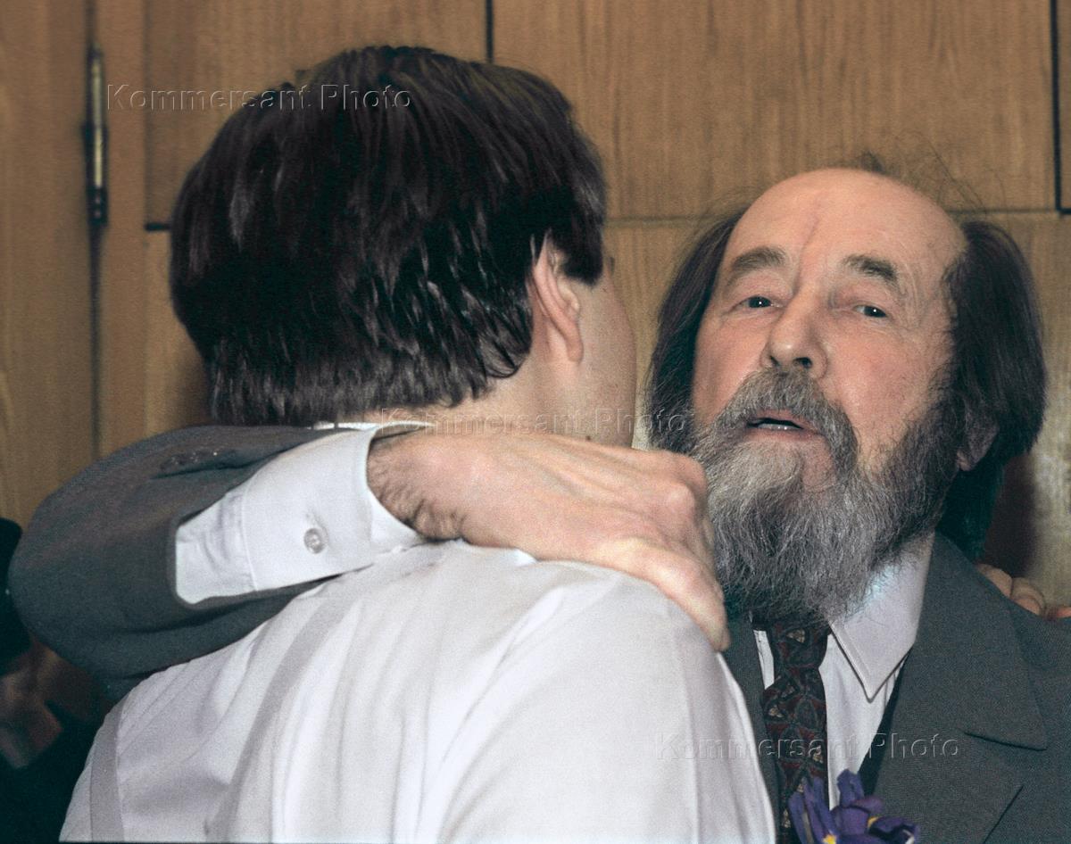 Писатель Александр Солженицын после концерта пианиста Игната Солженицына. Концерт сына писателя прошел в Большом зале консерватории.