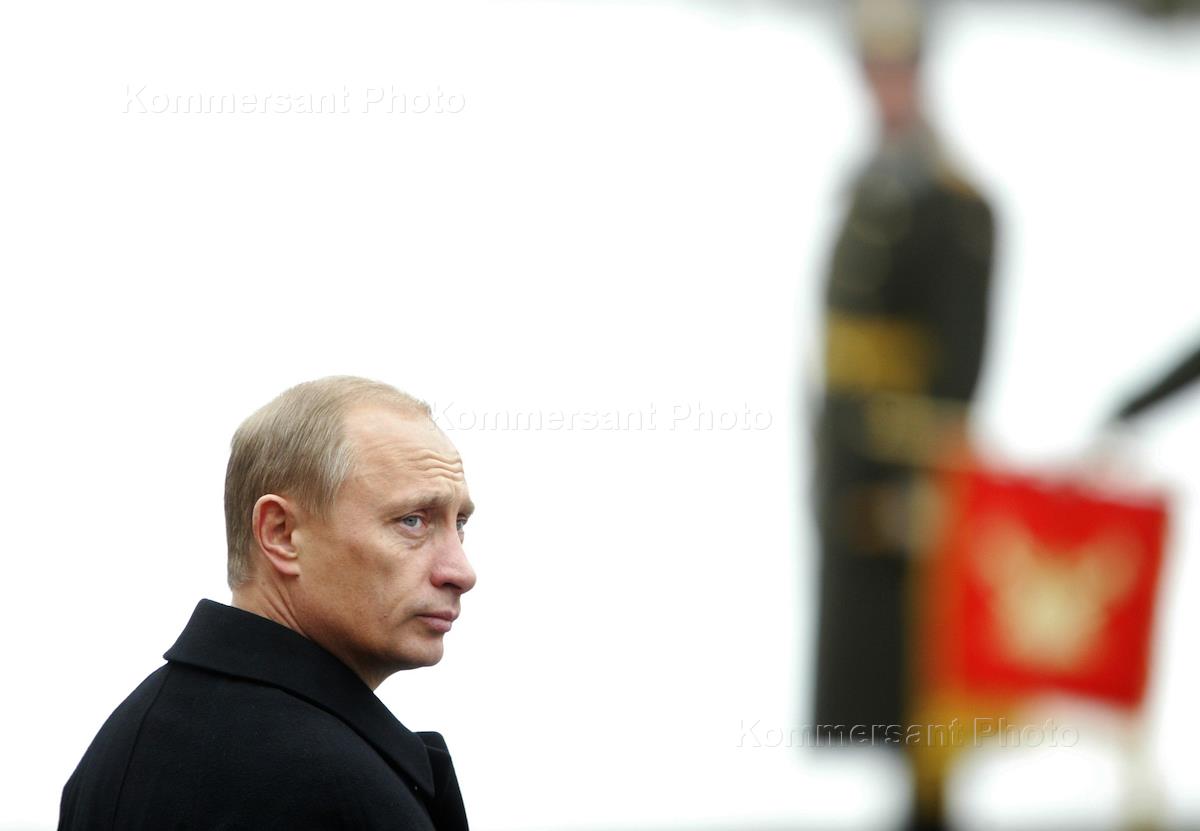 Russian President Vladimir Putin (right) talks to Prime Minister Mikhail Kasyanov (left) during the wreath laying ceremony at the Unknown Soldier Tomb by the Kremlin walls. The ceremony was held on February 23 - Fatherland Defender Day.