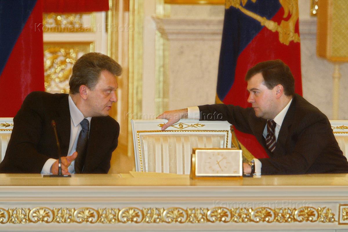 Исполняющий обязанности председателя Правительства России Виктор Христенко (слева) и руководитель администрации Президента России Дмитрий Медведев (справа) на совместном заседании Совета безопасности России и президиума Государственного Совета России в Александровском зале Большого Кремлевского дворца.