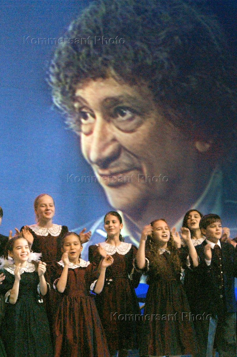 Children's band "Neposedy" performs at the concert devoted to the 35th activity anniversary of composer Yury Entin (on the screen). The event was held in the State Kremlin palace.