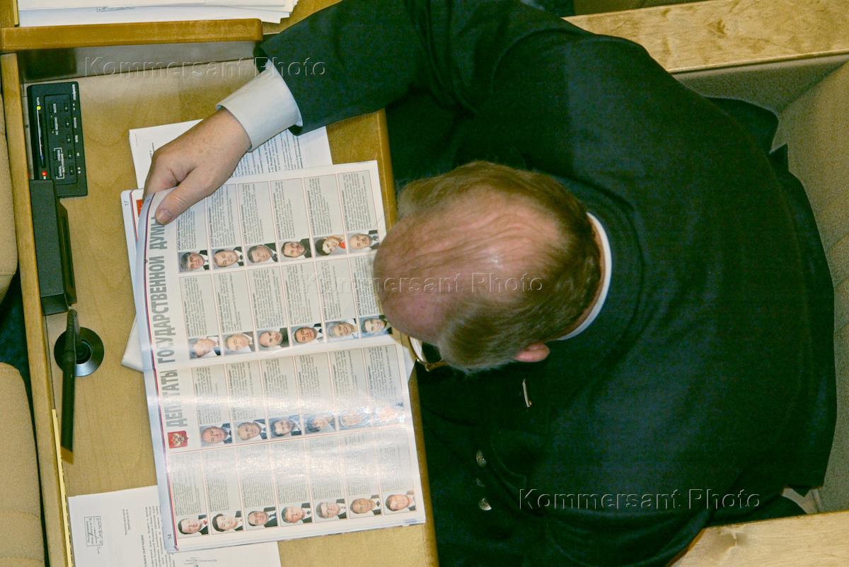 Russian State Duma deputy discerns portraits of deputies in magazine at the Duma session.