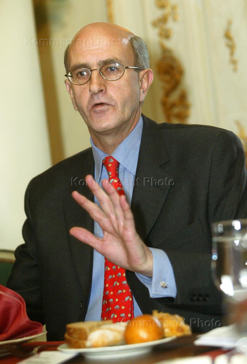 The general managing director of "Menatep SPb" bank Chris Evans is interviewed in "Pushkin" cafe.