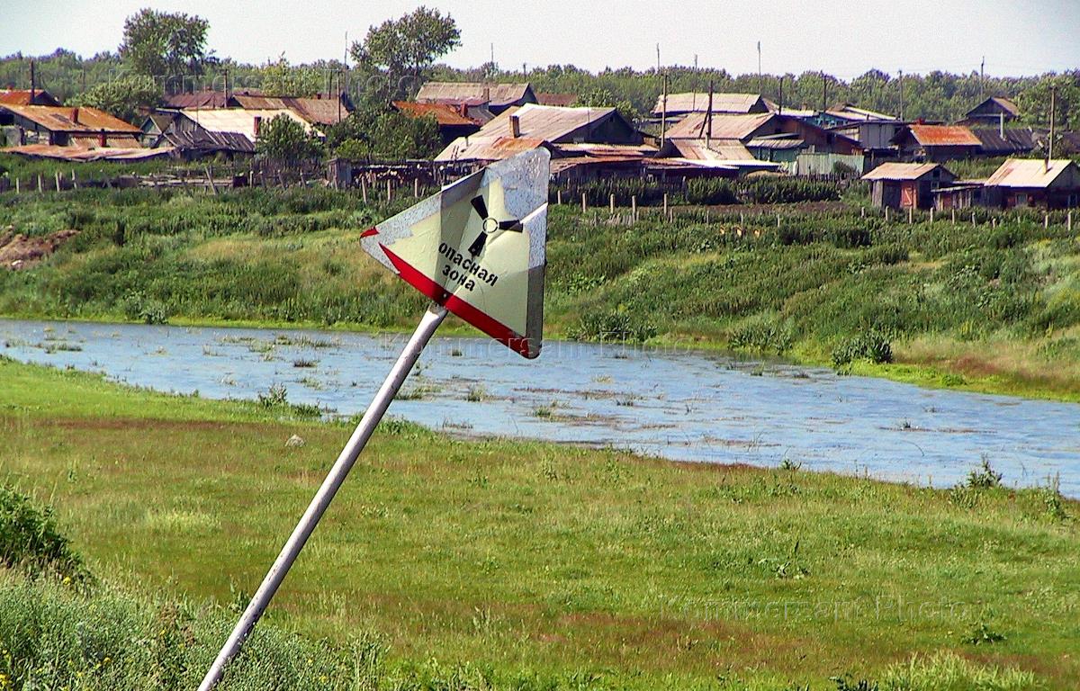 "Dangerous zone" sign near the Techa river poisoned with nuclear waste from Mayak plant.