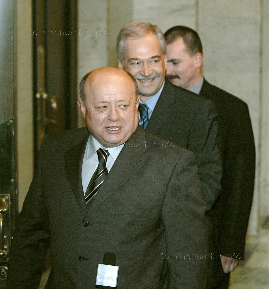 Председатель Государственной Думы (Госдумы) России Борис Грызлов (в центре) и кандидат на должность председателя Правительства России Михаил Фрадков (в центре) во время проведения консультаций с фракциями Госдумы.