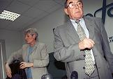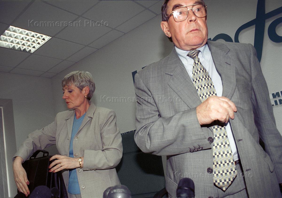 Председатель Высшего арбитражного суда России Вениамин Яковлев (справа) и председатель Федерального арбитражного суда Московского округа Людмила Майкова (сзади) после пресс-конференции в агентстве "Интерфакс".