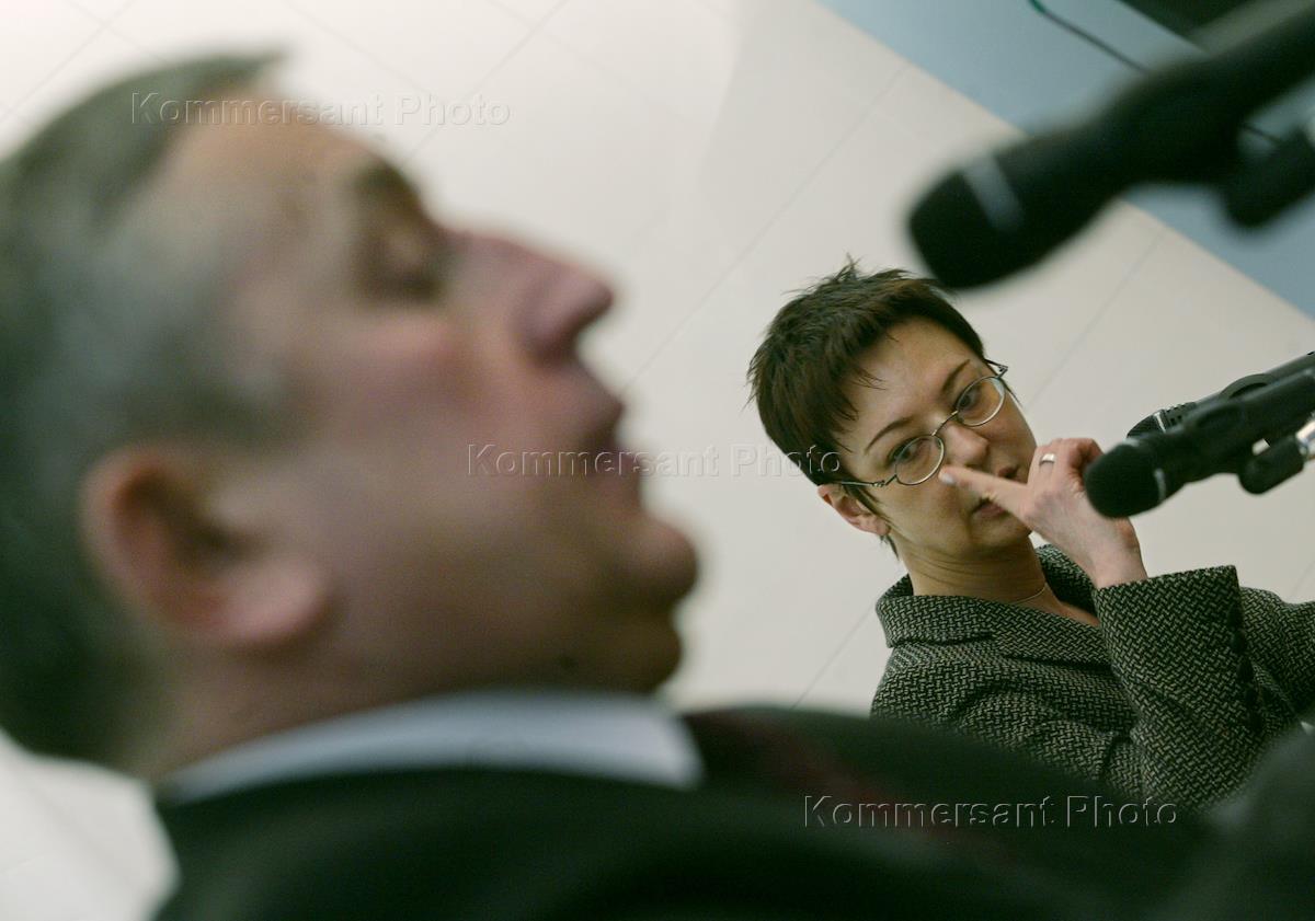 Self-nominated Russian presidential candidate Irina Khakamada takes part in the debate with the Communist Party (KPRF) candidate Nikolay Kharitonov. The debate took place in the RosBalt news agency.