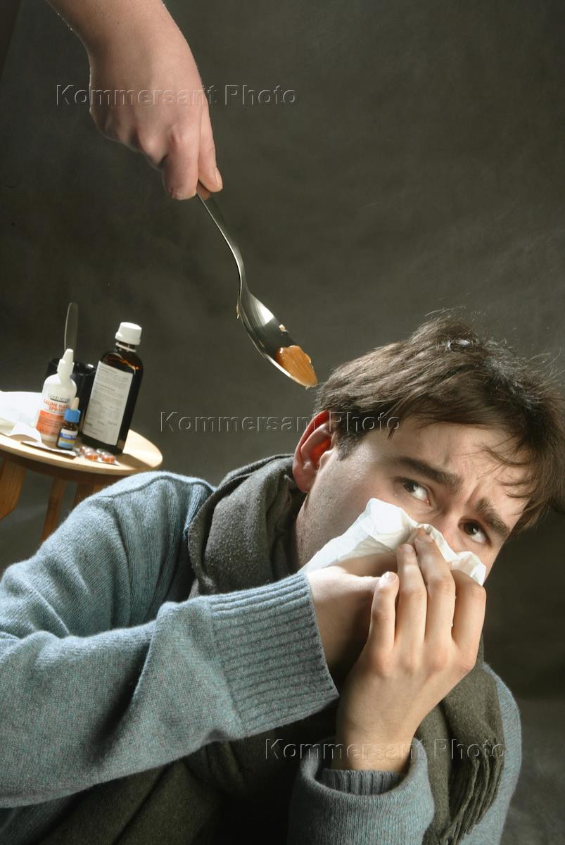 Fallen ill man ("Kommersant" publishing house journalist Alexander Voronov) sits on the floor with a spoon of honey and a thermometer.