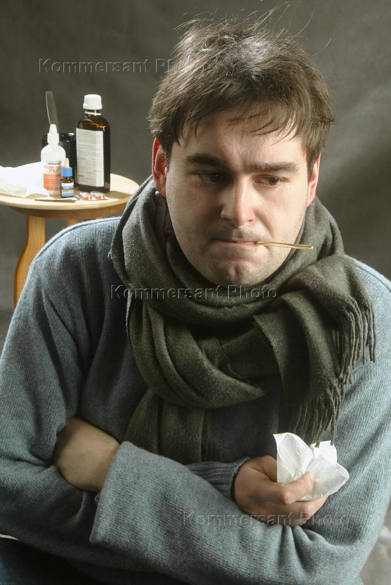 Fallen ill man ("Kommersant" publishing house journalist Alexander Voronov) sits on the floor with a spoon of honey and a thermometer.