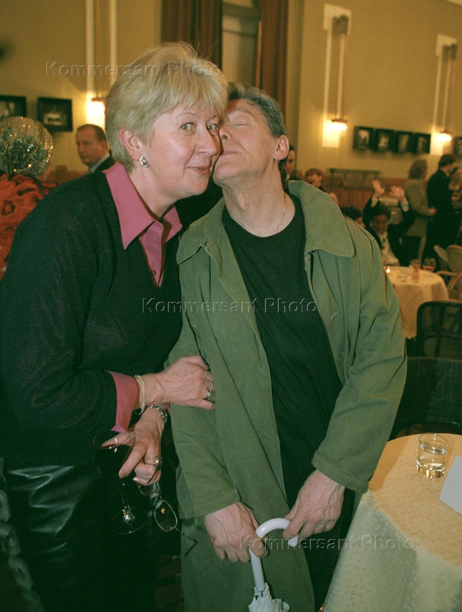 Russian actor Alexander Abdulov (left) poses for a photo with the Russian deputy culture minister Natalya Dementyeva during the party held in the Lenkom Theatre to celebrate actor's Oleg Yankovsky's birthday.