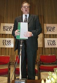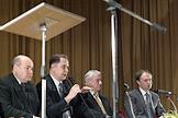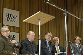 Министра культуры и массовых коммуникаций России Александр Соколов (в центре), главы федеральных агентств подведомственных министерству: по архивному делу Владимир Козлов (слева), по культуре и кинематографии Михаил Швыдкой (второй слева) и по печати Михаил Сеславинский (справа) во время представления их сотрудникам министерства. Представление прошло в здании информационного агентства "ИТАР-ТАСС".