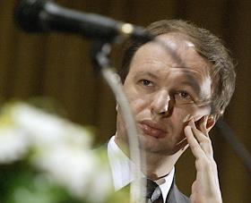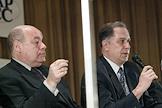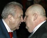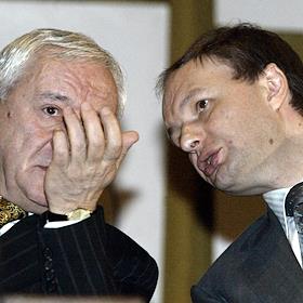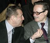 Министр культуры и массовых коммуникаций России Александр Соколов (справа) и руководитель Агентства по культуре и кинематографии Михаил Швыдкой (слева) во время представления их сотрудникам министерства. Представление прошло в здании информационного агентства "ИТАР-ТАСС".