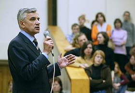 Кандидат на пост губернатора Архангельской области, глава ОАО "Молоко" Николай Киселев на встречи со своими избирателями перед вторым туром губернаторских выборов.