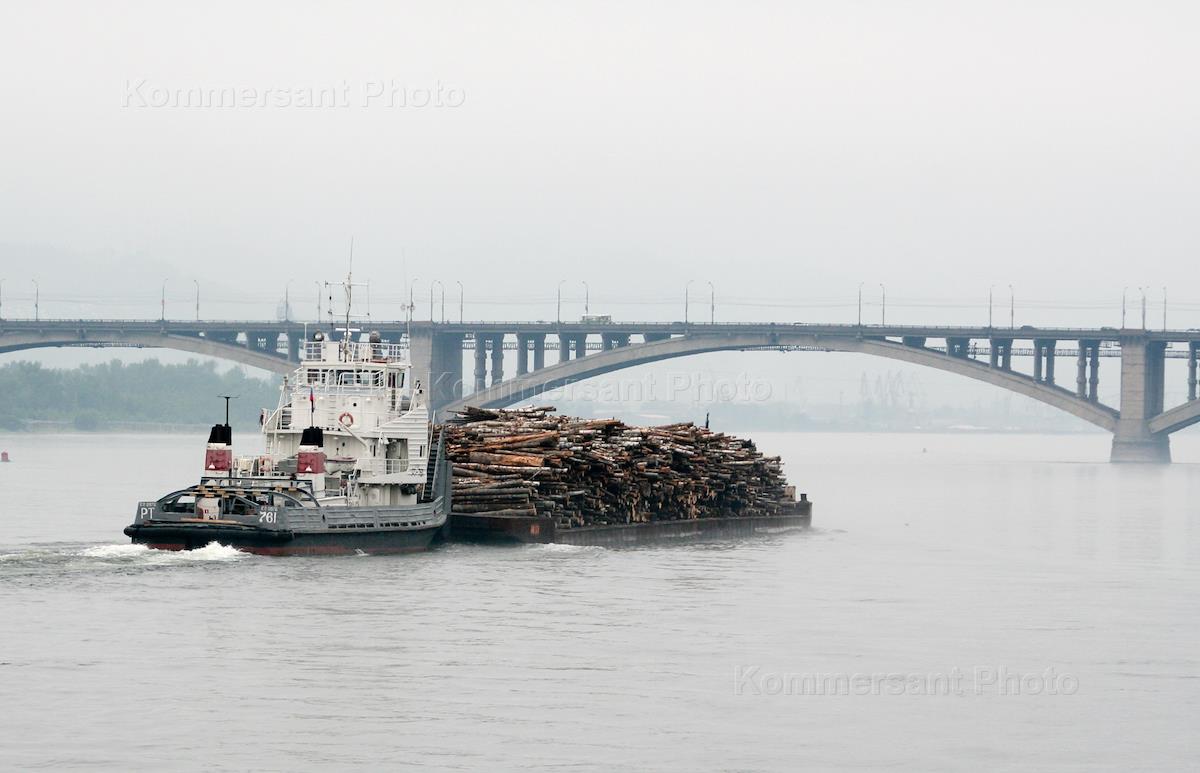 Виды Красноярская. Баржа с грузом леса-кругляка и автомобильный мост через реку Енисей.