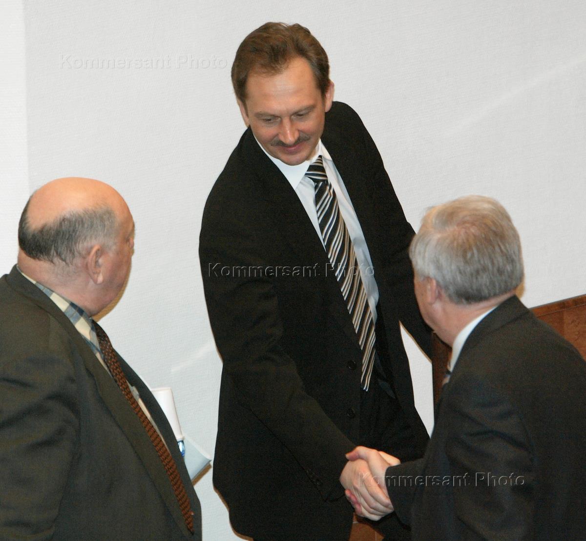 Chairman of the Council of Federation of Russia Sergey Mironov (at the left) and Minister of Education and Sciences Andrey Fursenko (on the right) attended the session of the Federation Council of Russia.
