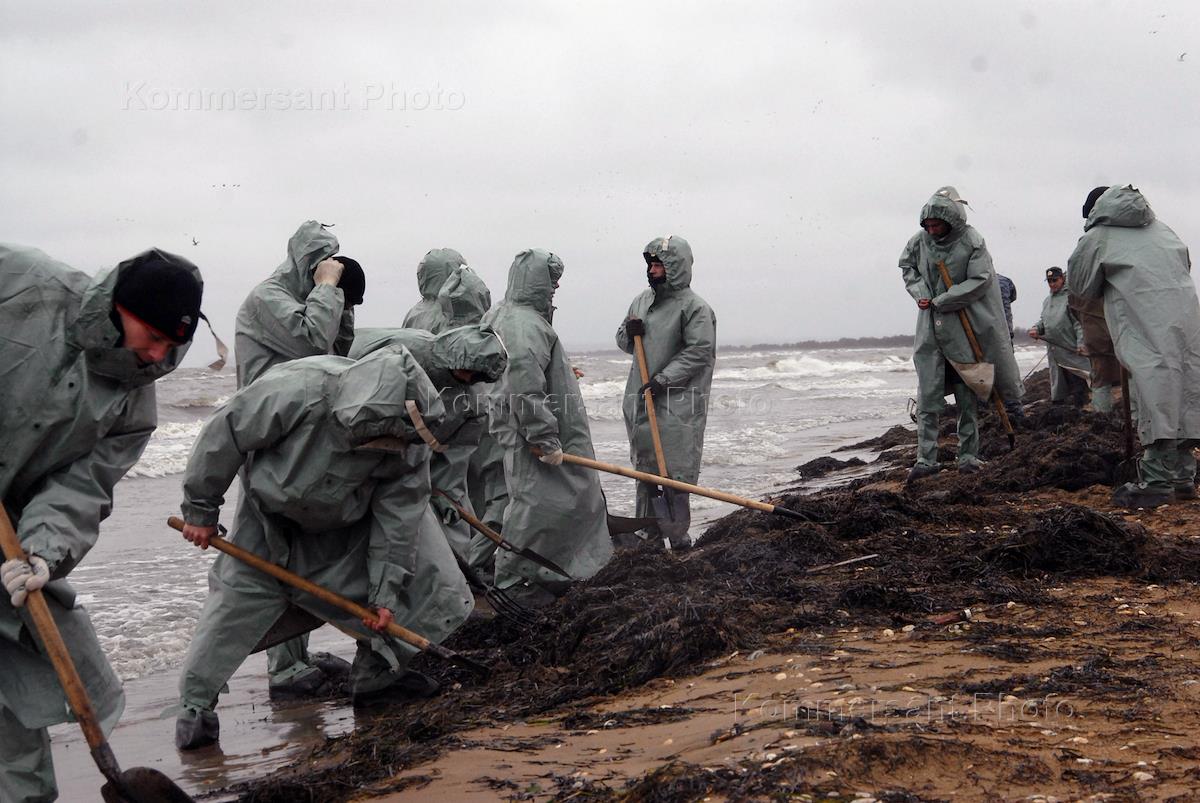 Ликвидация последствий аварий в Керченском проливе. Сбор мазута на берегу.