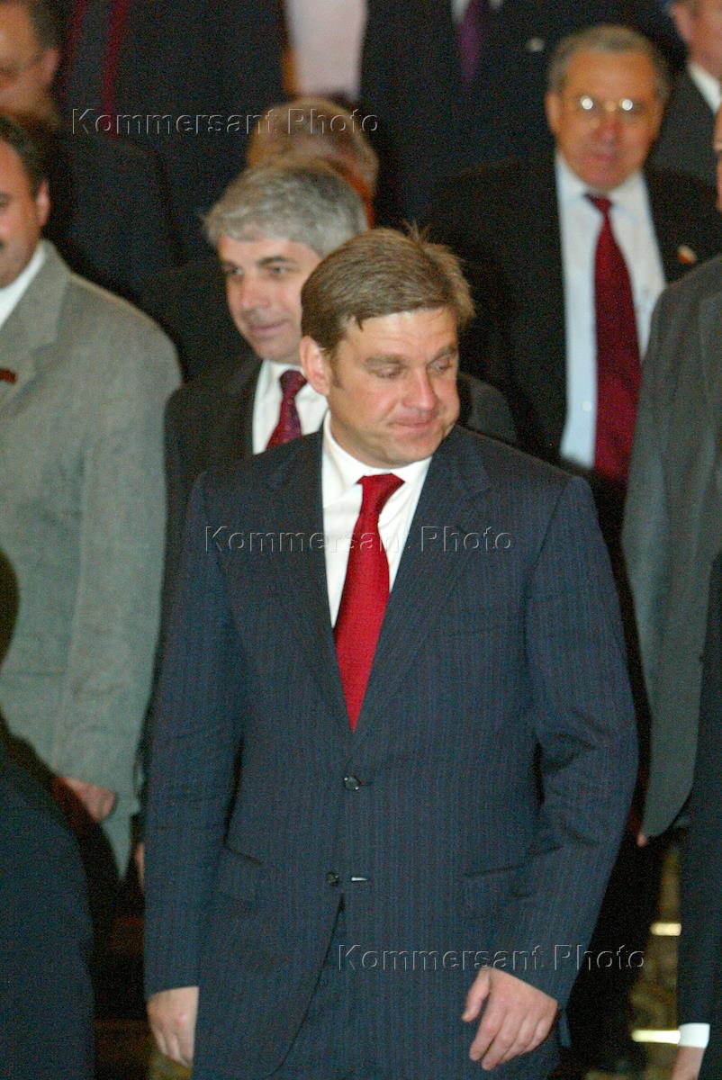Первый заместитель председателя Комитета Государственной Думы России по собственности Виктор Геращенко (в центре), полномочный представитель Президента России в Южном федеральном округе Владимир Яковлев (справа) и заместитель председателя Комитета Государственной Думы России по кредитным организациям и финансовым рынкам Владимир Тарачев (второй справа) в фойе Мраморного зала Кремля перед выступлением Президента России Владимира Путина с традиционным ежегодным посланием к Федеральному собранию России.
