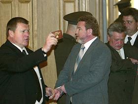 Депутат Государственной Думы России четвертого созыва Александр Коржаков (справа) на входе в Мраморный зал Кремля перед выступлением Президента России Владимира Путина с традиционным ежегодным посланием к Федеральному собранию России.