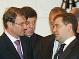 Руководитель администрации Президента России Дмитрий Медведев (справа), руководитель аппарата Правительства России Дмитрий Козак (в центре) и министр экономического развития и торговли России Герман Греф (слева) в Мраморном зале Кремля перед выступлением Президента России Владимира Путина с традиционным ежегодным посланием к Федеральному собранию России.