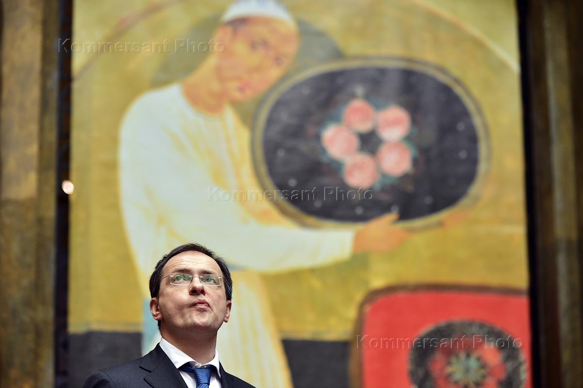 Министр культуры России Владимир Мединский на пресс-показе выставки "Сокровища Нукуса", из собрания Государственного музея искусств Республики Каракалпакстан имени И. В. Савицкого (Узбекистан), в Государственном Музее изобразительных искусств (ГМИИ) имени А.С. Пушкина.