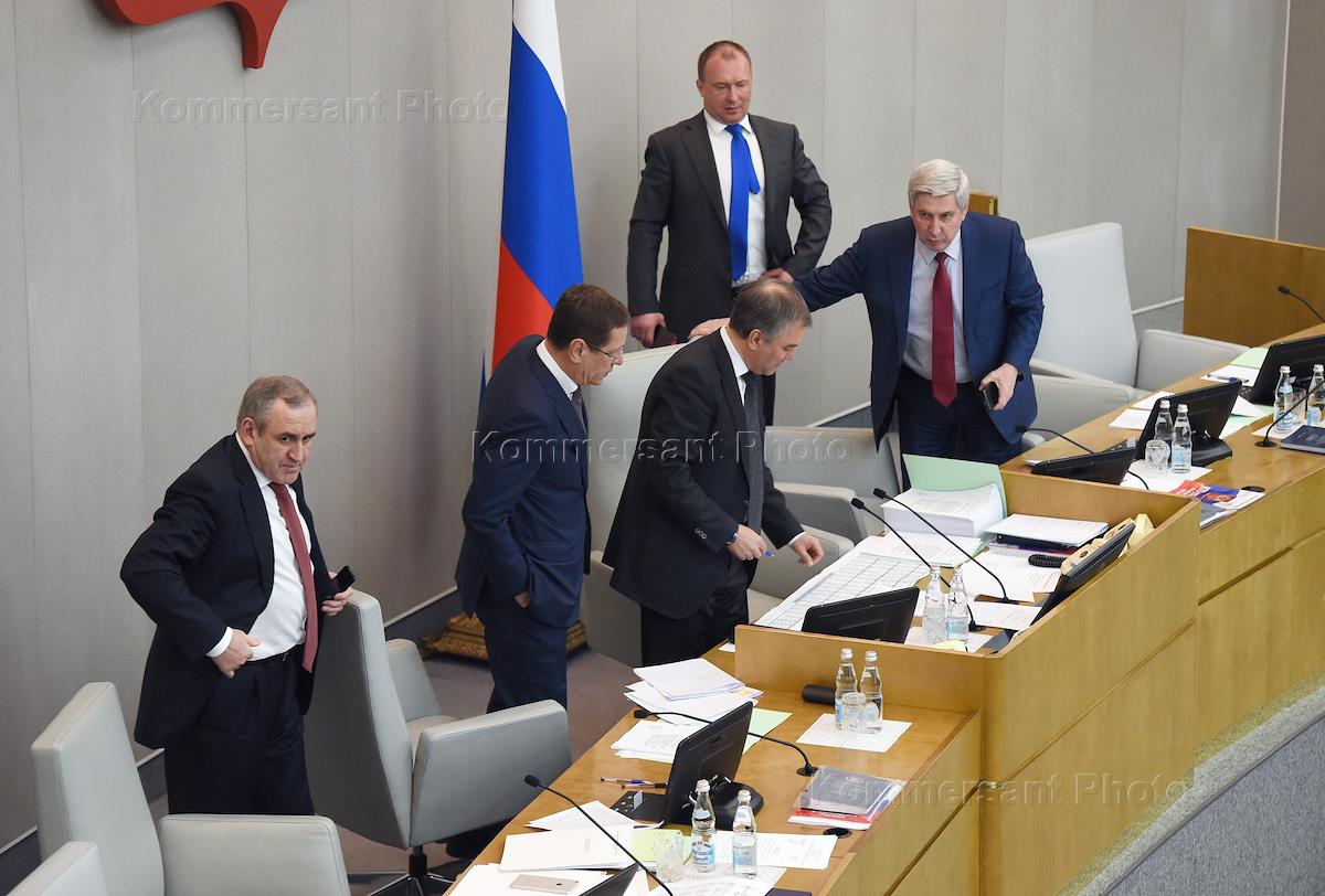 Пленарное заседание Государственной думы (ГД) России. Слева направо: заместитель председателя ГД России Сергей Неверов, первый заместитель председателя ГД России Александр Жуков, заместитель председателя ГД России Игорь Лебедев, председатель ГД России Вячеслав Володин и его первый заместитель Иван Мельников перед началом заседания.