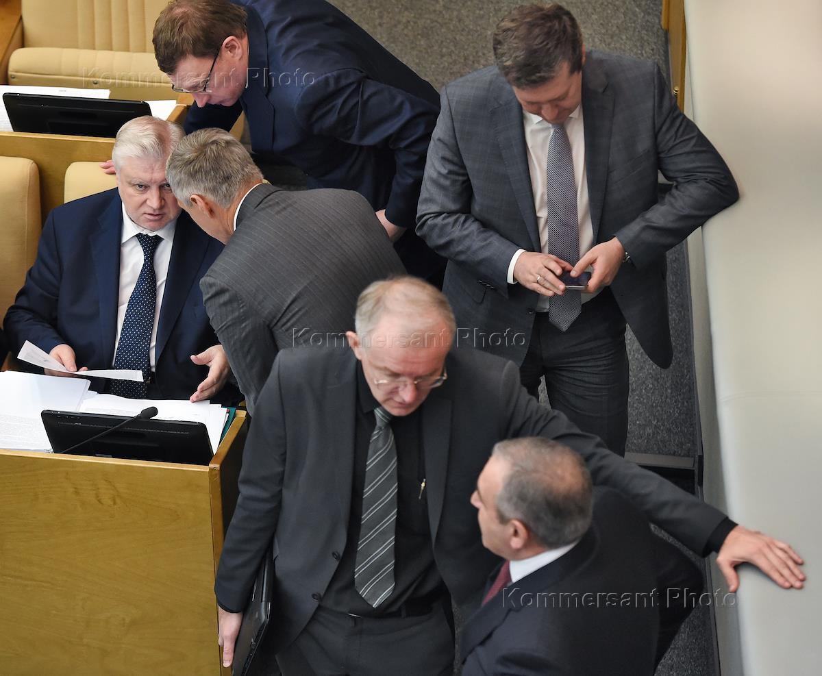 Пленарное заседание Государственной думы (ГД) России. Лидер партии "Справедливая Россия" Сергей Миронов (слева) во время заседания.