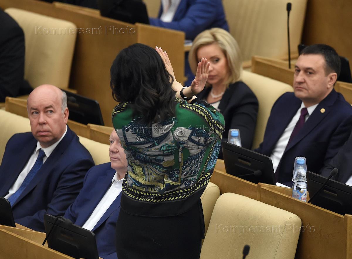 Пленарное заседание Государственной думы (ГД) России. Заместитель председателя комитета Государственной Думы России по информационной политике, информационным технологиям и связи Марина Мукабенова (в центре) во время заседания.