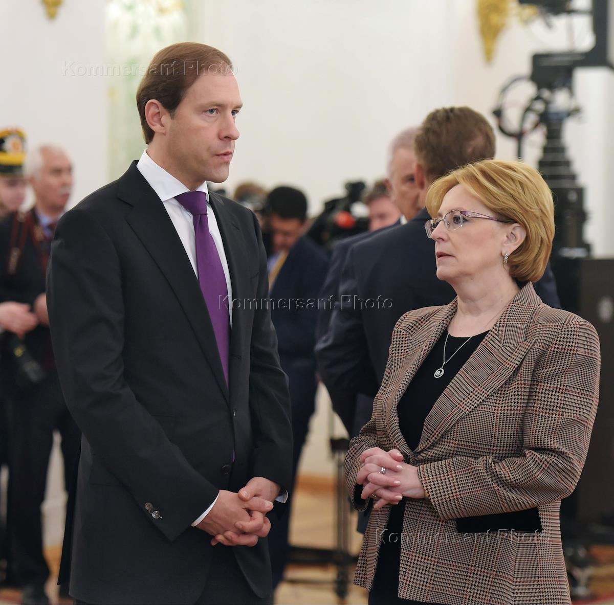 Встреча президента России Владимира Путина с президентом Узбекистана Шавкатом Мирзиеевым в Кремле. Министр промышленности и торговли России Денис Мантуров (слева) и министр здравоохранения России Вероника Скворцова (справа) перед началом встречи.